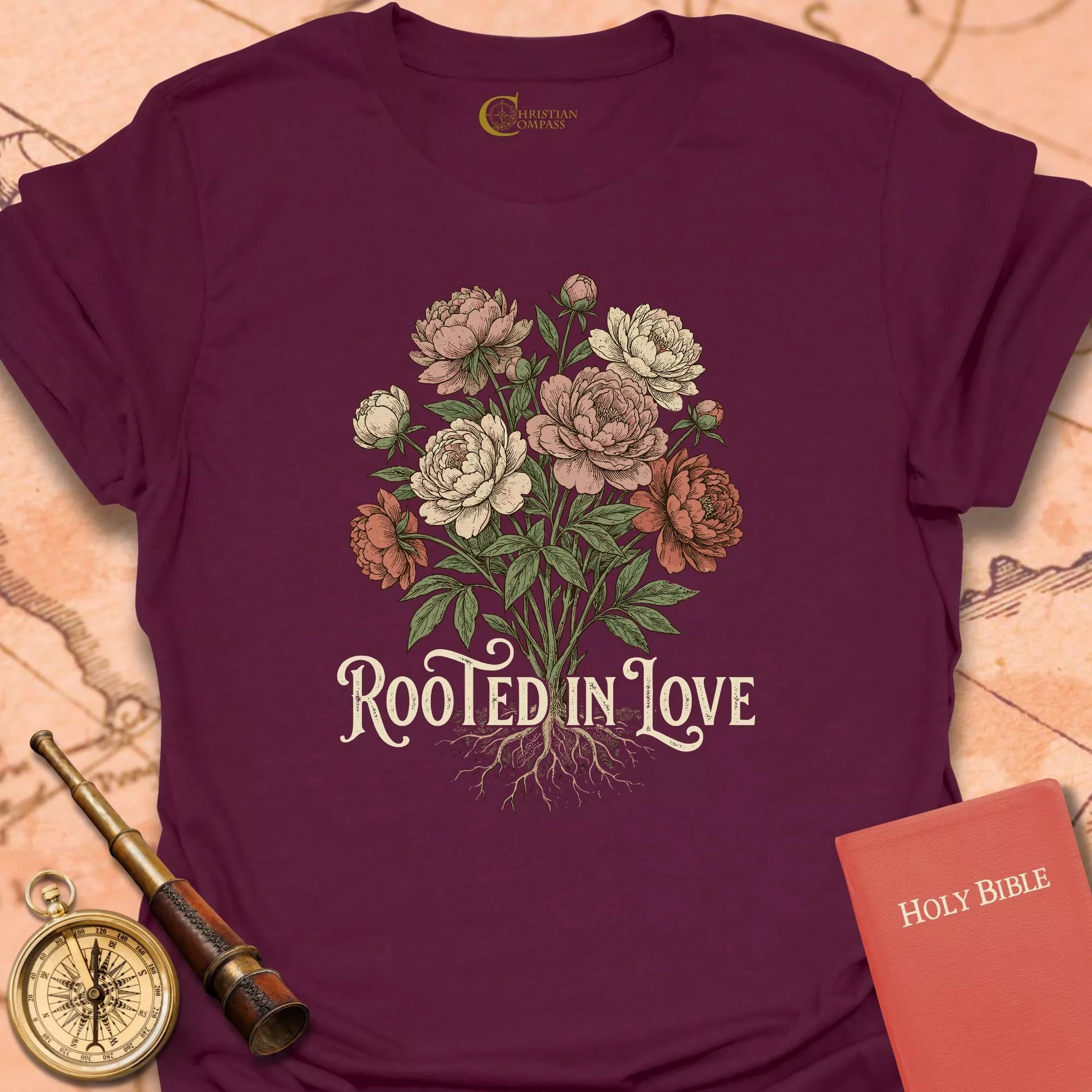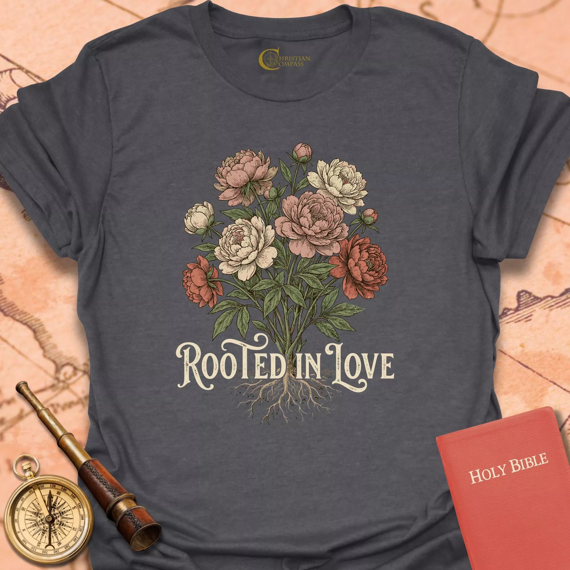 Rooted in Love Christian T-Shirt – Vintage Floral Faith Tee – Christian Compass Skip to content