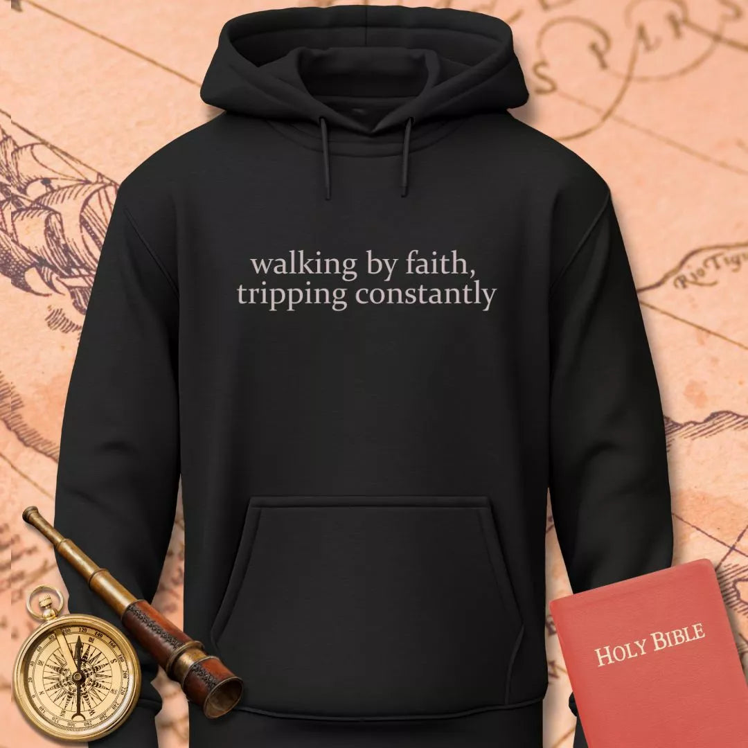 Walking by Faith Tripping Constantly Hoodie – Christian Hoodie for Women & Men, Faith Apparel, Inspirational Sweatshirt – Christian Compass Skip to content